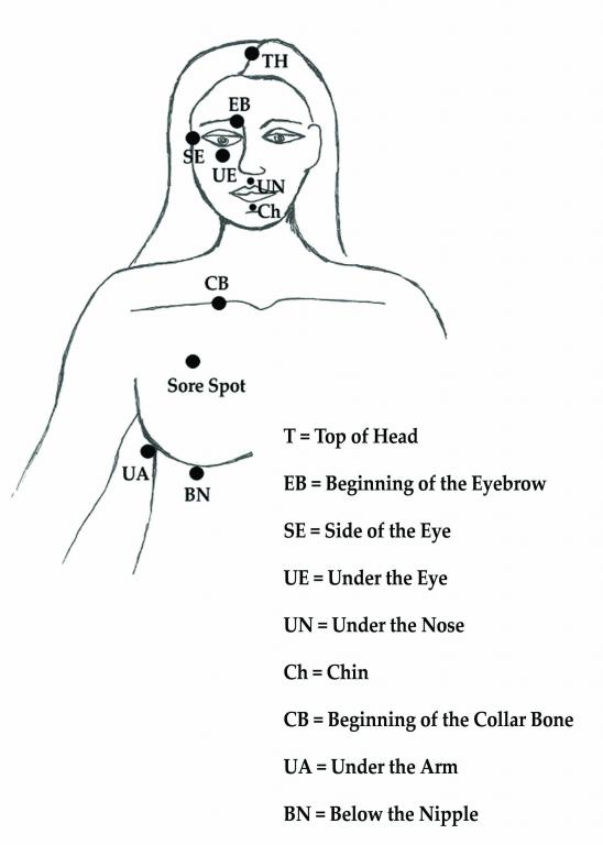 See the illustrations below for meridian points, use 2 fingers to tap the points, or rub the spot. Create your affirmation by inserting the negative emotion you are working on into this phrase: "Even though I have this negative emotion I deeply and completely accept myself."