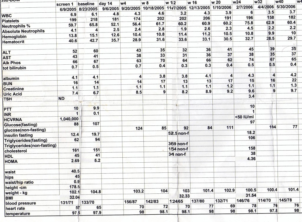 The discussion between isiscat, drivingon and others raises a scary but obvious question we will all face sooner or later. "In our role as Guinea pigs, what sorts of long term effects, other than SVR, can we expect?". I sure hope it isn't a long list of neurological disorders, even slight ones. Also I don't want joint and back pain, chronic dry skin, thin hair, weakness and tiredness, and so forth. And has anybody taken a look at what this poison is doing to my ailing liver? Today I feel pretty good, and am playing it to the fullest. Tomorrow I will give myself the 17th in a series of 36 weekly injections, which will be followed by major labs Monday AM. I am in this up to my neck. It feels too good to be bad. But I just pray for no big surprises later in life.