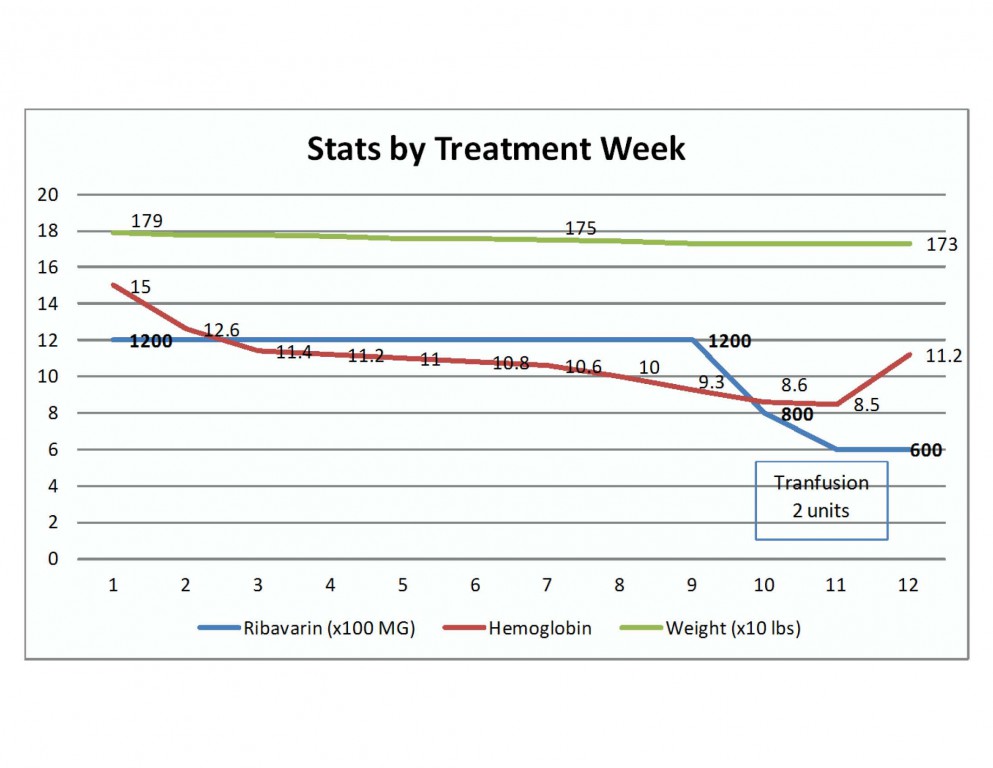 When I hit 8.5 hgb at wk 11 my doc sent me for a 2-unit transfusion which worked wonders. I went from near-crawling to 30-minutes walks in 24 hours. She had already reduced me to 600 mg riba where I remain. She seems unconcerned about the lower dose but I am and would like to creep it back up to maybe 800. I also took one shot of procrit which made my bones ache mildly affter a week or so, which lasted for 2 wks. Last blood test was 2 wks ago and I was at 11.2 hgb.