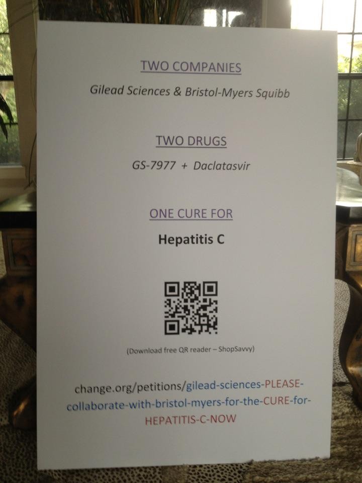 "Quoting from ETAG: "The most effective new therapy for hepatitis C -- two pills that could cure nearly every patient treated -- may never see the light of day because the developers of these new medicines, Bristol-Myers Squibb and Gilead Sciences, seem unable to work together. Apparently, profits are more important than best patient care. Best therapy combines Bristol's daclatasvir with Gilead's GS-7977. Each is a single pill administered once a day. The results from this new therapy are nothing short of spectacular -- an early cure rate of 100% for genotype 1 patients and 91% of genotype 2/3 patients, according to data from a mid-stage study announced Thursday at the European Association for the Study of Liver Disease (EASL) meeting. Amazingly, this most promising new treatment for hepatitis C patients may actually be discontinued because Bristol and Gilead can't work together. Gilead needs to justify that $11 billion and deliver profits and returns to its shareholders. Collaborating with Bristol would more than likely dilute Gilead's Hep C profits, which helps explain why Gilead isn't exactly thrilled to push ahead. Hep C patients in need of convenient and potent new cures are being hurt." Please sign this petition to urge Gilead to work with Bristol-Myers Squibb on this drug combination for the benefit of those suffering with hepatitis C."