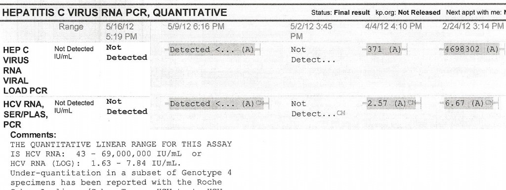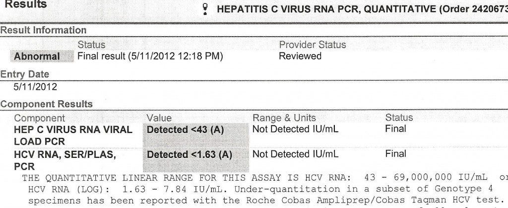 Because the HCV RNA level was below 43 IU/mL using the Real-Time PCR method, the sample was assayed using the Transcription-Mediated Amplification(TMA) method." Good luck, Judy and everyone on this journey,