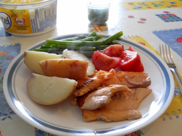 hope we are not to late but here is a special spring plate of asperigus, aoura trout and fresh potatoesand tomatoes, I know it is all under the snow somewhere. Congradulations