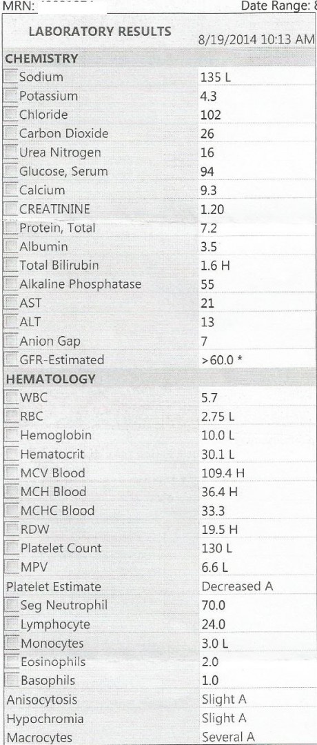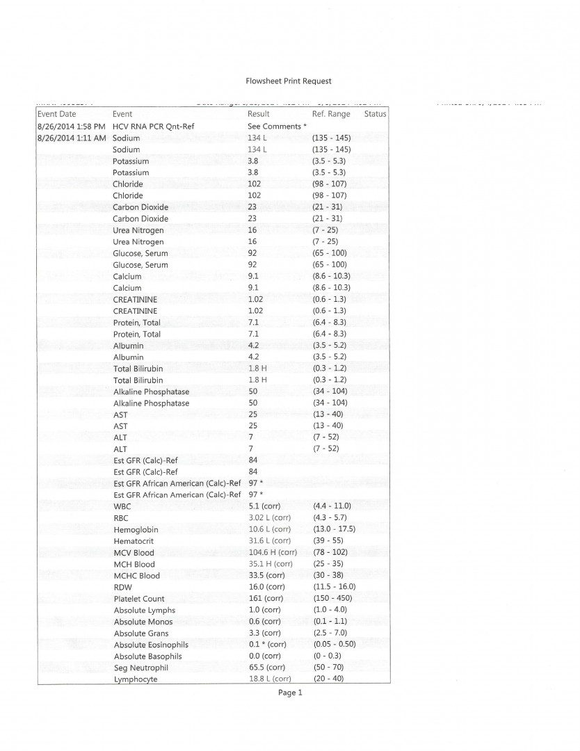 Here are some of the results from my 4 wk post SOT labs done yesterday. I suppose I'll have to wait until 8-26-14, when I see my Hepatologist, to get the VL, AST, ALT etc.