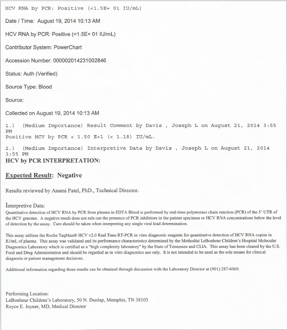 The blood for this latest result 8-19 and on 8-6, was tested @ LeBonheur Childrens Medical Center Laboratory using Roche TaqMan HCV v2.0 Real Time RT-PCR in vitro diagnostics reagents for quantitative detection of HCV RNA copies in IU/mL of plasma.