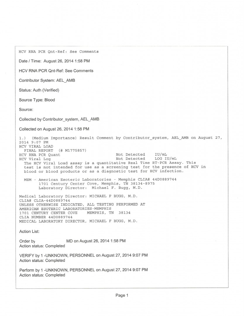 The blood drawn 5-2-14 (results attached) and yesterday was at the transplant center where my Dr's office is. And tested @ Clinical Pathology Laboratory in Austin TX USA using Real-time PCR, Roche COBAS Ampliprep/Taqman v2.0.