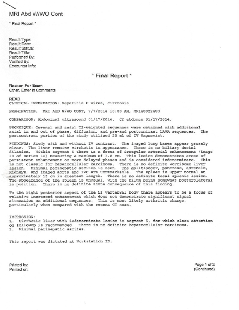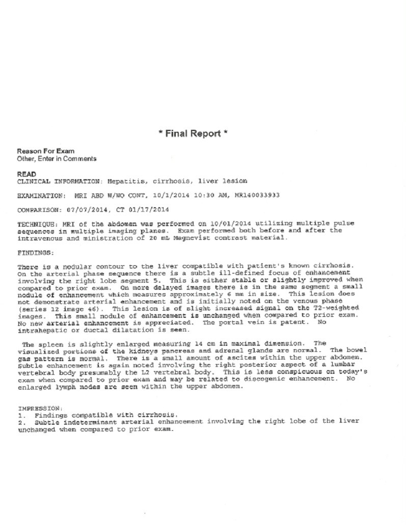Also I included the MRI final report from 3 months ago 7-7-14, also compared to 1-17-14 abdominal ultrasound and CT abdomen.