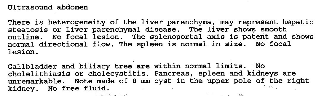 Sounds like you've got a bit of a fatty liver issue going on there. No lesions noted and everything else is unremarkable. There's a small cyst in the right kidney, but it doesn't appear to be a concern. Malcolm can elaborate on this and I'm sure he'll provide some input when he checks in.